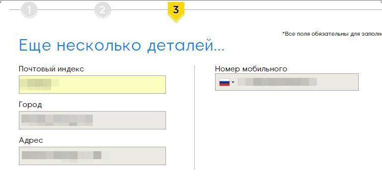 Шаг № 4. В следующем окошке вводим свой почтовый индекс, город, адрес, номер мобильного.