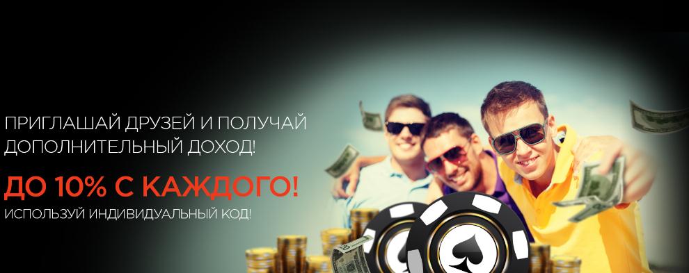 Если же Вы пригласите более 5 друзей, которые пополнят свой счет и начнут активную игру, то Вы навсегда будете получать 10% рейка от всех друзей! Выгодно, не правда ли?