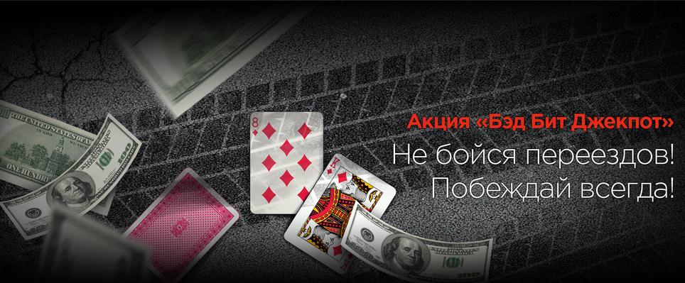 Тем, кто играет за специальными столами «Бед-бит джекпот» на RuPoker, больше не грозят переезды. Если вдруг Вашу комбинацию каре семерок или лучше «переедет» более мощная комбинация карт, то Вы получите солидный куш — часть от джекпота!