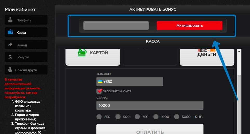 Шаг № 3. Укажите необходимый бонус код RuPoker в специальном окошке вверху и нажмите «Активировать».