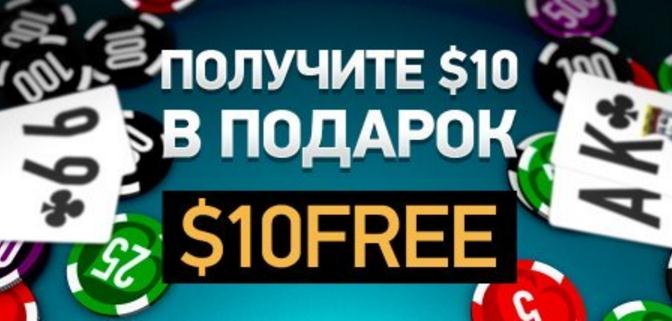 Укажите промокод «$10FREE» при первом пополнении счета и получите еще столько же! Сумма бонуса будет предоставлена Вам в виде наличных и турнирных билетов, и не требует отыгрыша, однако для вывода бонусных 5 долларов наличными потребуется наиграть 250 баллов Pkr в турнирах и кеш игре на реальные деньги.
