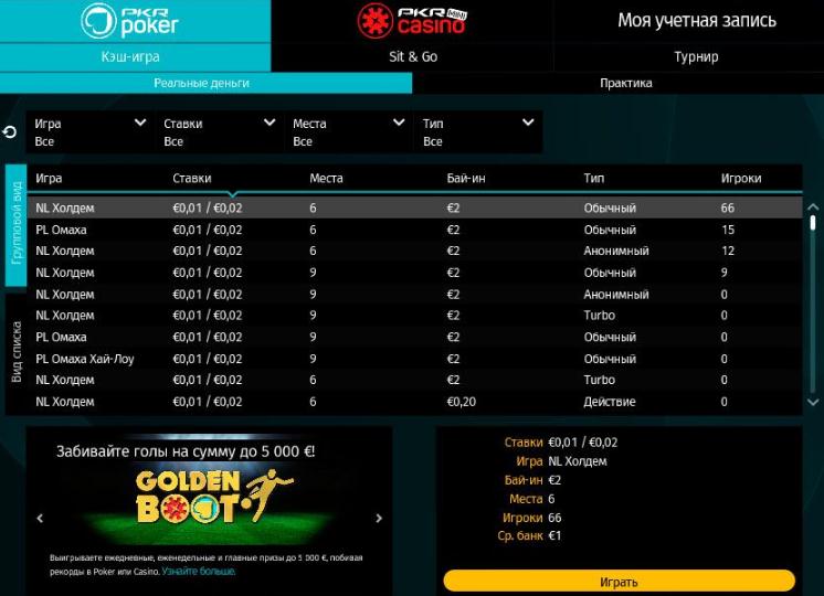 Играть онлайн на PKR Poker можно в самые популярные виды покера, среди которых Техасский Холдем, Омаха Хай и Хай Лоу на самых различных лимитах: без лимита (NL), лимитные (L) и пот-лимитные (PL).
