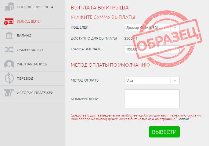 Вывести свой выигрыш можно аналогичным способом, выбрав вкладку «Вывод денег». Поддерживаются денежные системы: кредитные и дебетовые карты Visa, электронные кошельки WebMoney, Skrill, Neteller.
