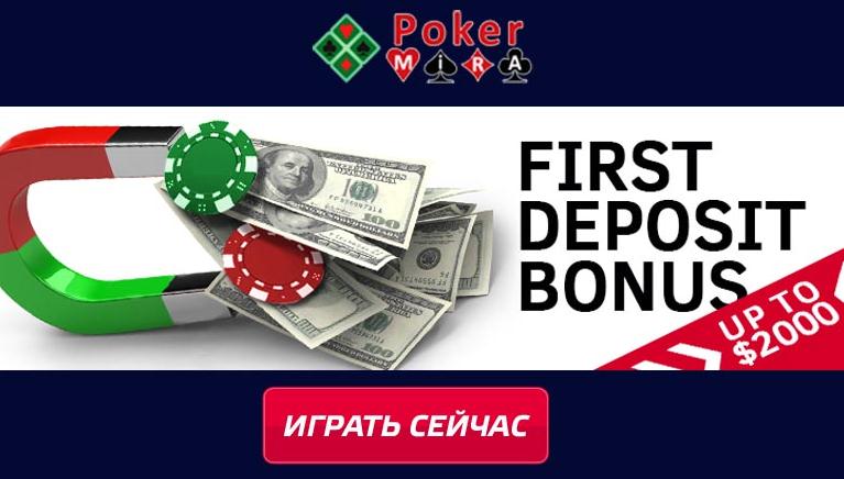 Poker Mira раздает невероятно щедрые бонусы тем игрокам, которые впервые пополняют свой счет! Внесите на свой депозит от 10 до 2000 долларов и получите 100% сверху. Бонус будет выдаваться по 10 долларов за каждые 200 VIP очков, полученных Вами. У Вас будет ровно 1 месяц, чтобы отыграть весь бонус полностью. Кроме этого, Вы получите пять билетов на турниры Sit and Go по 25 центов и один билет на участие в фриролле $100 Depositors Freeroll с призовым фондом 100 долларов. Не плохое начало, не правда ли?