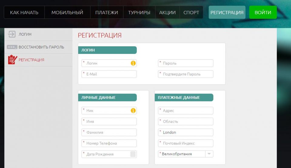 - Заполните поля следующей формы: логин, электронная почта, пароль, никнейм, имя, фамилия, номер телефона, дата рождения, страна, город и адрес проживания, почтовый индекс.