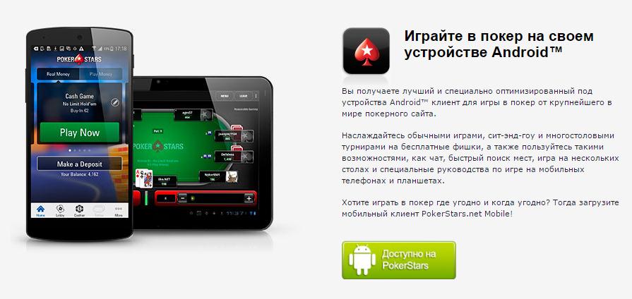 Все игроки ПокерСтарс могут скачать приложение для своих телефонов и планшетов на базе Андроид и iOS. Сделать это можно на официальном сайте покер-рума, либо найти клиент в специализированных магазинах: Play Market для Android и App Store для продукции Apple. Приложения мало чем отличаются по функционалу от своего старшего собрата для ПК, разве что выбор игр немного меньше. Надеемся, Вы по достоинству оцените все преимущества мобильного клиента от PokerStars.