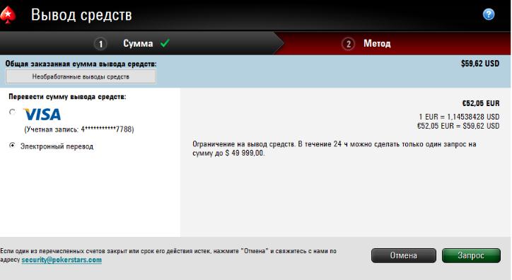 Длительный срок вывода на Visa, EntroPay и некоторые другие системы — данные сроки зависят в первую очередь от самих денежных систем и PokerStars не могут ускорить этот процесс. Если деньги нужны Вам максимально быстро, воспользуйтесь системами Neteller и Skrill — здесь деньги выводятся в течение нескольких минут/часов.