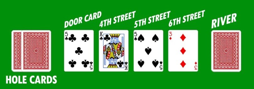 - Седьмая улица: каждому участнику раздачи сдается еще по одной карте, но теперь в закрытую. Происходит еще один круг торговли, по прошествии которого игроки вскрывают свои карты и определяется победитель раздачи.