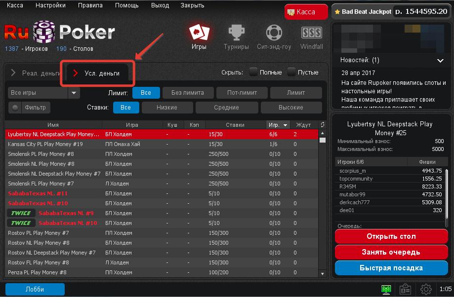 Для этих целей как нельзя лучше подойдет игра на условные фишки, с помощью которой Вы сможете играть онлайн бесплатно на RuPoker и получать ценный опыт покерного игрока. Чтобы перейти в данный режим достаточно открыть вкладку «Условные деньги» в главном лобби покер-рума.