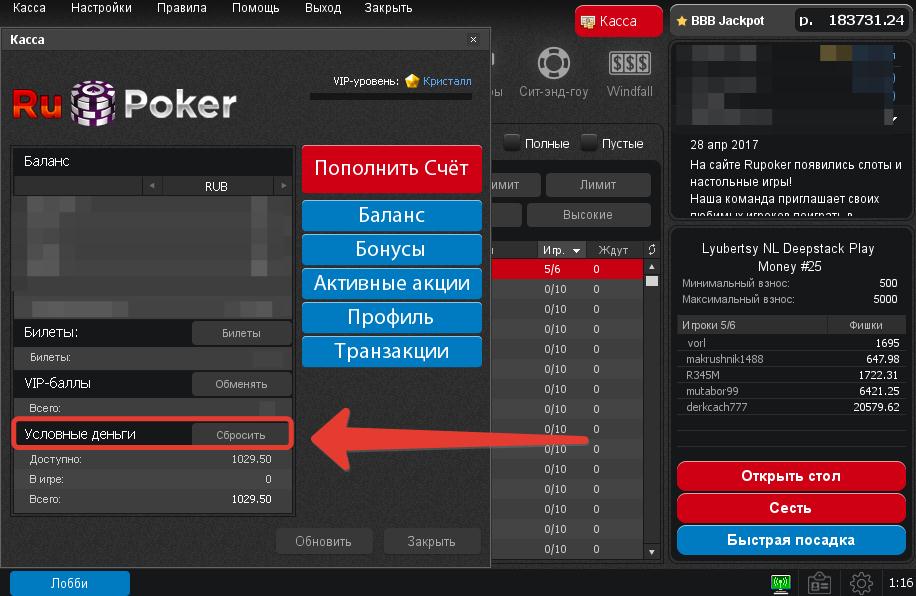 Каждый игрок после регистрации получает 1 000 условных фишек абсолютно бесплатно. Если так случится, что Вы все их потратите, не беда: Вы также можете пополнить счет еще на одну тысячу. Чтобы добавить условные деньги на счет зайдите в меню «Кассы» и выберете функцию «Сбросить условные деньги». Совершать эту процедуру можно не чаще, чем раз в час. Играть онлайн бесплатно на RuPoker очень просто, проверьте сами!