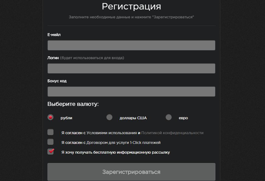 Шаг № 2. Укажите Ваш действующий электронный адрес почты, выберете валюту (рубли, амеркианские доллары или евро), дайте согласие с правилами и условиями покер-рума и обработкой 1click платежей «птичками» в соответствующих полях.