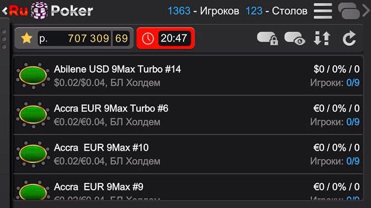 В главном лобби РуПокер для iOS Вы найдете все необходимое: фильтры для выбора подходящего cash стола или турнира, гибкие настройки интерфейса, свободный доступ к «Кассе» и всем ее инструментам. Сразу после запуска приложения Вам будет доступен выбор столов на любой вкус.