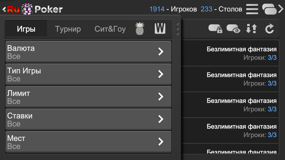 Переключаться между режимами игры Вы сможете отодвинув шторку с левой стороны. Там Вы обнаружите вкладки по кеш игре, турнирам, Windfall, Boost Poker и Sit and Go. Там же Вы сможете выбрать игру на условные или реальные деньги, а также расширенные фильтры поиска стола.