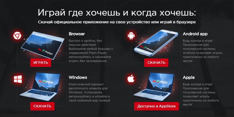 Вы можете установить клиент игры на ПК или ноутбук с операционной системой Windows, а также скачать на мобильный телефон или планшет на базе Андроид или iOS. Также Вы можете играть в RuPoker на реальные деньги прямо в браузере, без необходимости устанавливать программу покер-рума.