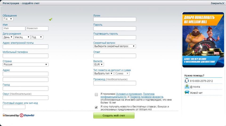 Обязательно поставьте галочку рядом с «Я принимаю Условия и положения, Политика конфиденциальности, и Правила проверки возраста, опубликованные на этом веб-сайте и подтверждаю, что мне более 18 лет», а также рядом с «Я хочу получать новости о бесплатных ставках, бонусах и эксклюзивных предложениях от William Hill» если хотите получать новости покер-рума по электронной почте. Нажмите на кнопку «Создать счет».
