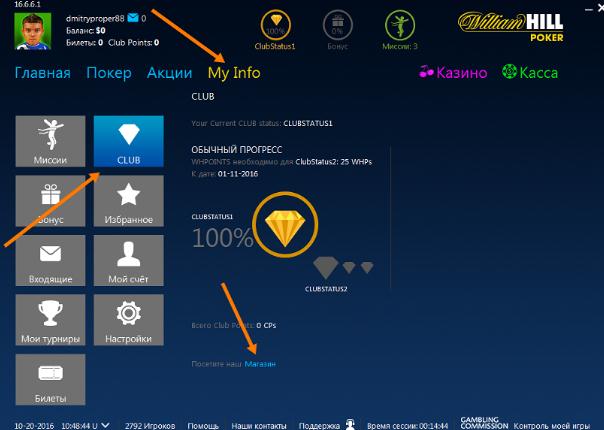 Бонусные очки William Hill Poker зарабатывать очень легко: просто играйте на реальные деньги в кеш-игру и турниры, и получайте баллы, которые определяют Ваш VIP статус и количество получаемых клубных очков, а также помогают высвободить Ваши бонусы. Бонусные очки William Hill Poker (WHPs) начисляются за рейк, снятый с Ваших ставок.